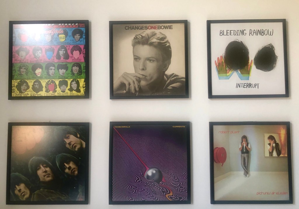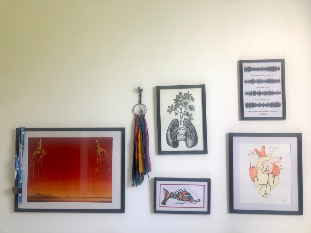The Elephants by Dali, a dream catcher I got in nyc, black and white print of lungs with flowers, beneath it – a watercolor fish smoking a joint, pretty heart, and my favorite: Bob Dylan’s “Like a Rolling Stone” song vibrations poster.